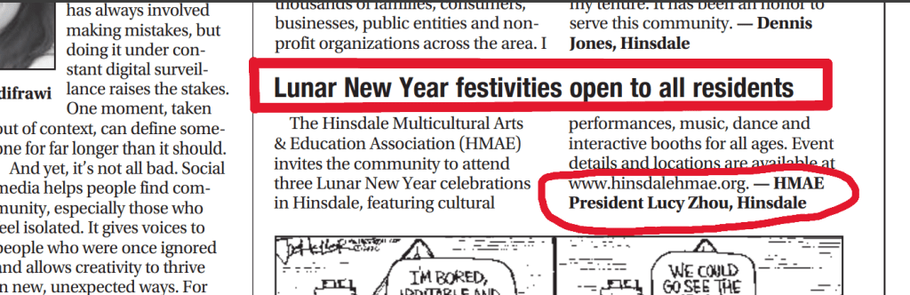 We are honored to share a Letter to the Editor recently published in The Hinsdalean, highlighting the inclusive spirit of Hinsdale’s Lunar New Year celebrations.